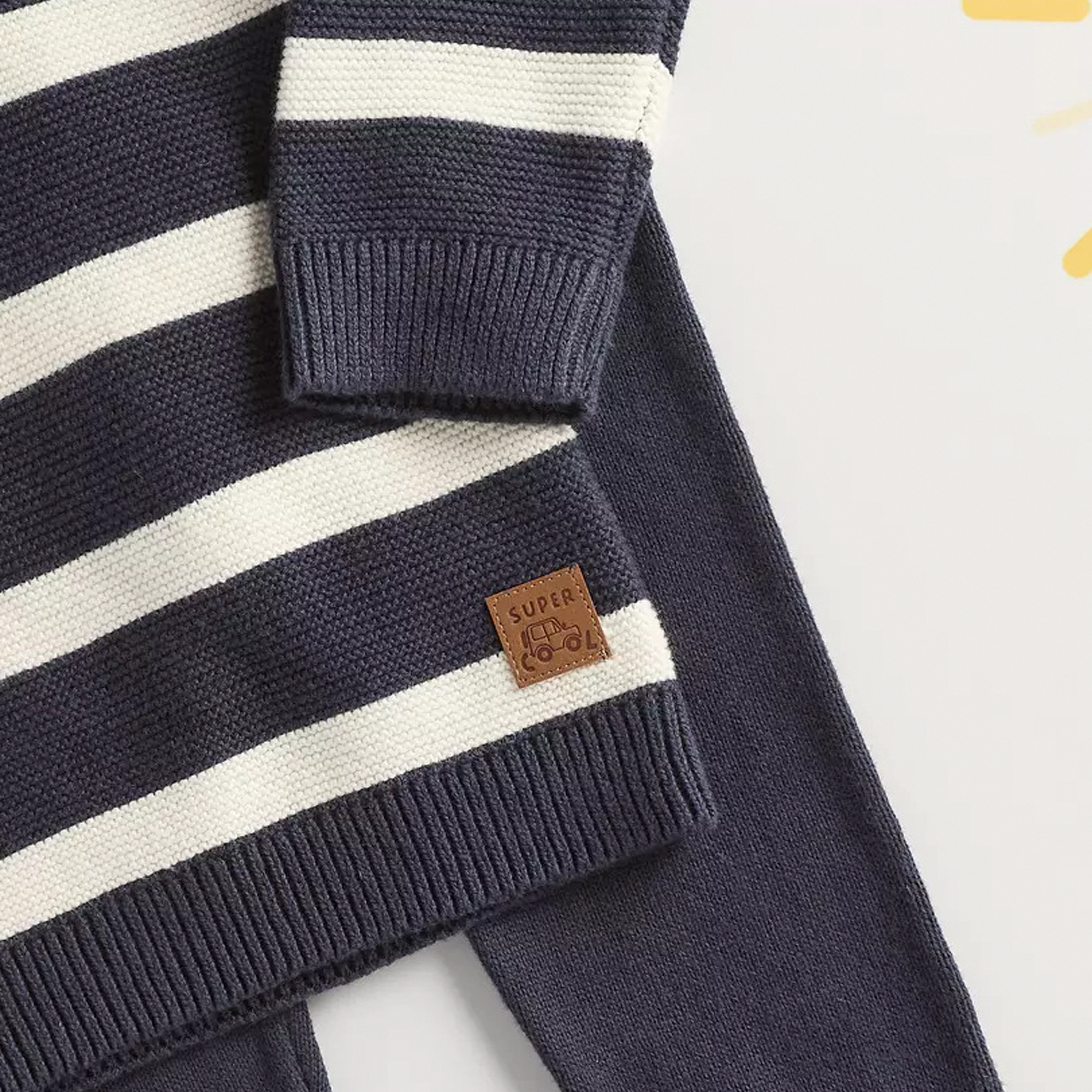 This charming set includes a cosy sweater and matching trousers, perfect for keeping your little one warm and stylish. The sweater features an adorable striped pattern, while the trousers have a comfortable elastic waistband.